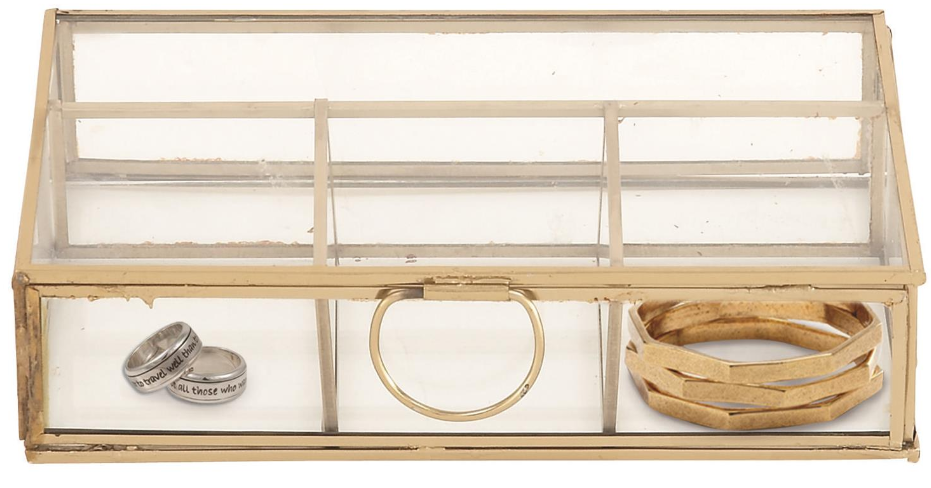 Rectangle jewelry case stands out with its polished gold finish and clear body, accented by metallic gold iron dividers and frames