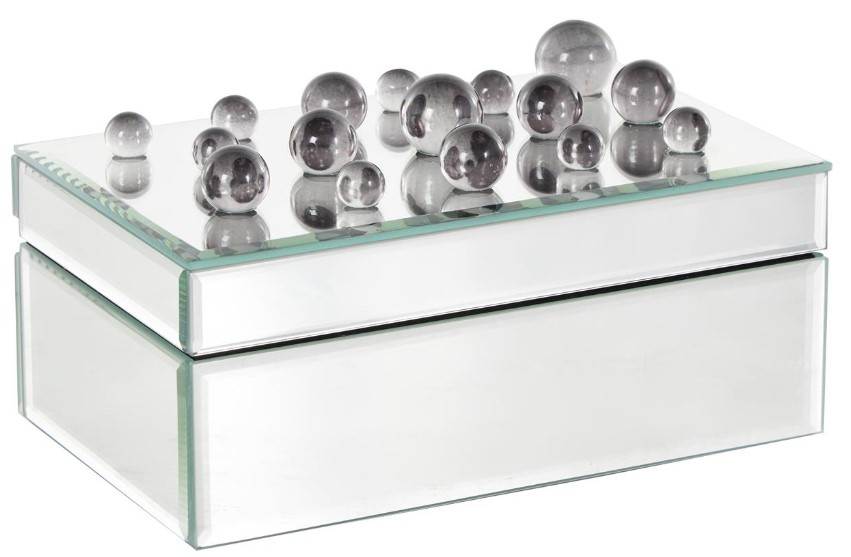 Mirrored silver jewelry storage has a sleek rectangular shape with round textured balls on top