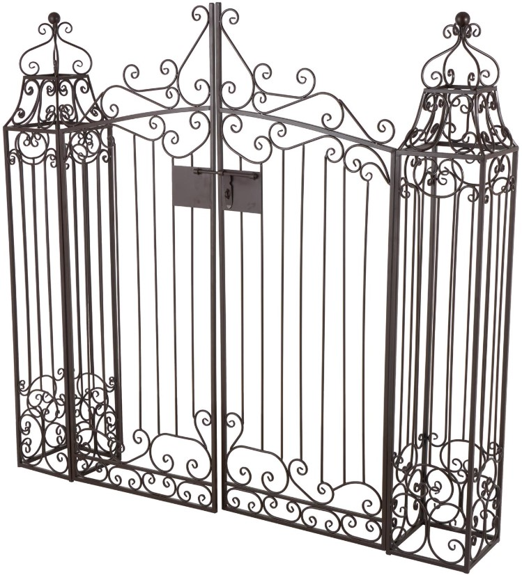 A vertical display arbor features scrollwork designs adorn the top and bottom of this wide gate