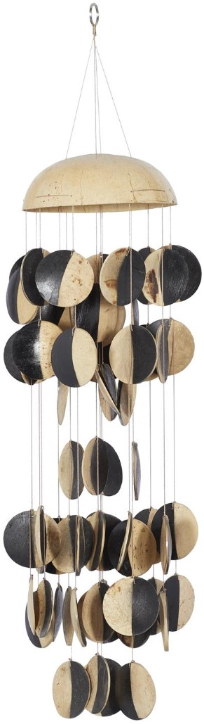 The coconut pieces feature textured cream and black finishes for added style. The decor is composed of a halved coconut shell base and smaller round coconut pieces, each suspended disc has a natural pattern.