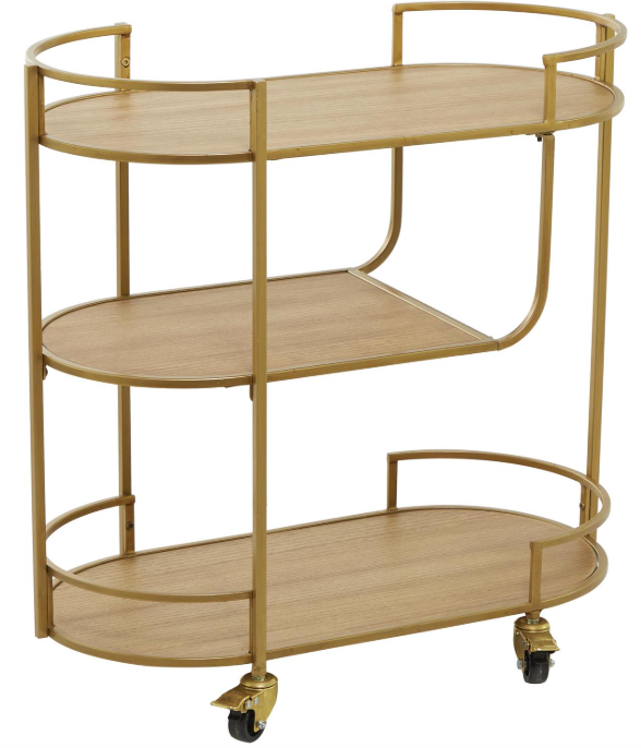 Rolling bar cart features a 3-tier oblong-shaped shelving display unit with geometric metal frames and round caster wheels