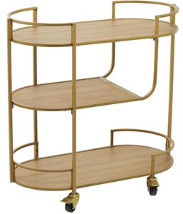 Embrace artistic expression with a style that highlights bold designs with sleek lines, neutral elements, and a minimalist aesthetic. Contemporary rolling bar cart is made of highly durable iron and Chinese red pine wood. Metal serving cart highlights a matte gold iron body with matte brown-finished wooden shelves and black rolling wheels. Gold serving push cart features 3-tier design that highlights a spacious floating shelf structure with a sleek frame and complemented with a 360 rolling wheels that come with an easy-lock mechanisms.