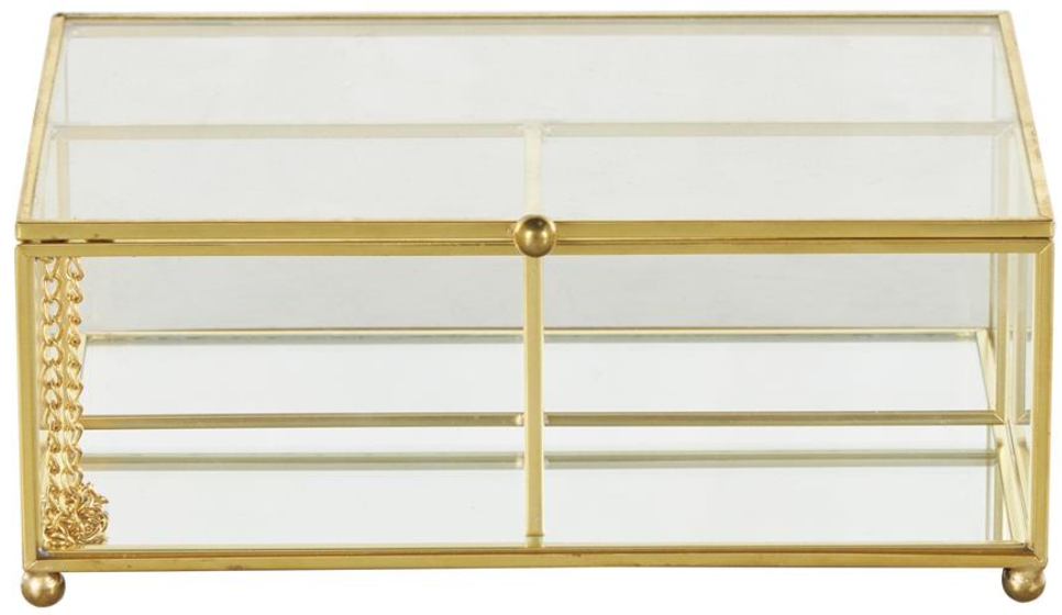 Rectangle jewelry case boasts a shiny clear glass exterior that glistens under light, complemented by a gold metal frame that adds an elegant touch. This glass jewelry box comes equipped with three slots, perfect for organizing your precious pieces, and an accent chain that enhances its aesthetic appeal..