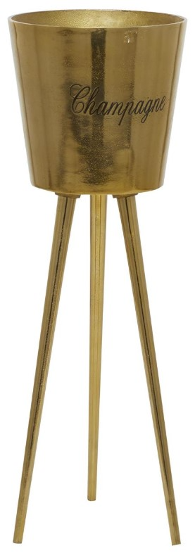Entertain in style or use as a storage display to keep your bottled beverages cool and protected on any surface with this standing gold wine bucket. This item ships in 1 carton. Aluminum ice bucket makes a great gift for any occasion. Suitable for indoor use only. This item ships fully assembled in one piece.