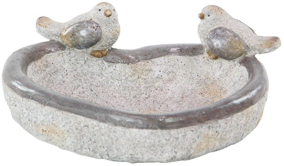 Crafted from polystone and fiberglass, this gray decorative garden sculpture offers durability for both indoor and outdoor use Animal sculptural garden accent is characterized by its rough and sandstone gray finish, accented with a striking golden beak, white base and small red spots. This polystone garden sculpture is thoughtfully designed with a heart-shaped bath bowl, adorned by two delightful birds sitting on the rim.
