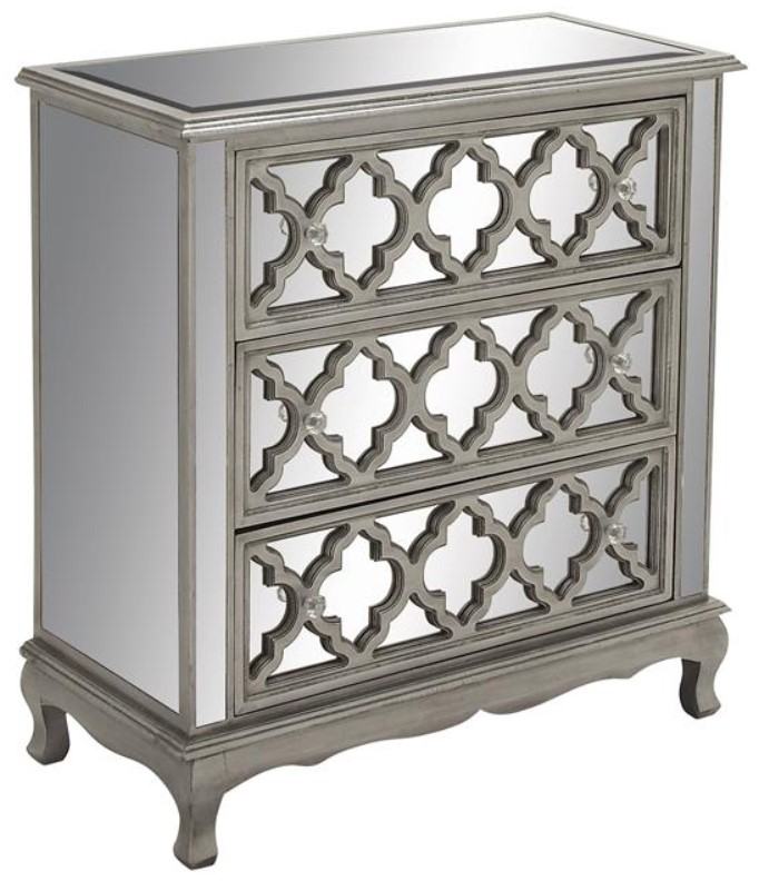 Indulge in the glamorous luxury of plush textures, dazzling details, and sleek finishes to elevate your home and add a sophisticated flair. Three drawers storage unit is crafted with MDF and mirror for a solid form. Glam chest of drawers carries metallic silver frames with mirror panels and clear round knobs. Silver storage unit features mirror paneling on the exterior with trellis overlay design on each spacious drawer and complemented with crystal rosette pull handles