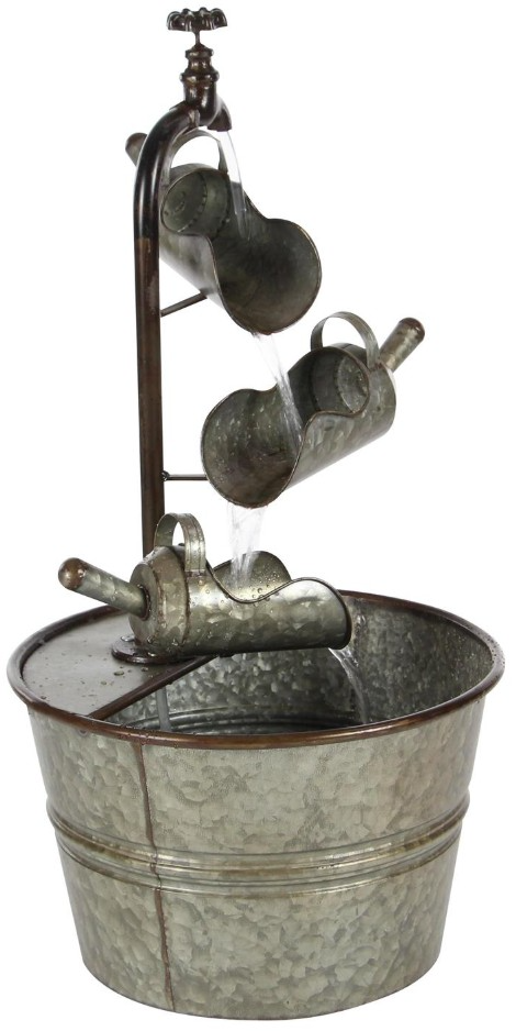 This metal fountain has a round basin reservoir in gray finish and features water tubing, faucet, and scooper-inspired deck.