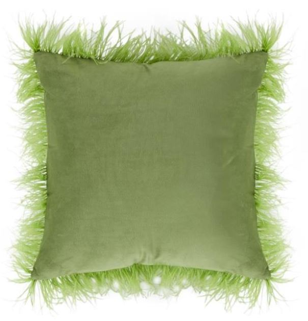 Green square pillow with green feather trim. Cotton pillow case with removable polyester fill cushion. Green pillow with thin, wispy, bright green feathers around the edges. Bold color and feather texture accents glam and eclectic style spaces.Read More