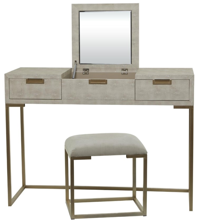 Contemporary dressing table featuring a light gray rectangular wooden vanity table designed with jewelry compartment, hinging top mirror, rectangular drawers with gold bar handles and a comfortable upholstered stool.