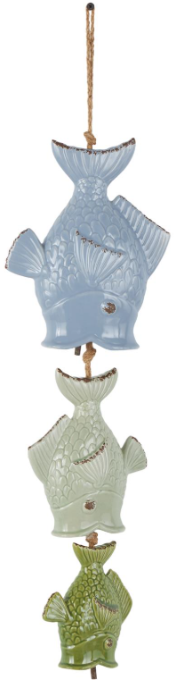 The fish wind chime is ideal for infusing patios or gardens with a nautical ambiance. This item ships in 1 carton. Can be hung vertically using the cotton cord; nails and screws not included. Suitable for indoor and outdoor use. This item ships fully assembled in one piece.