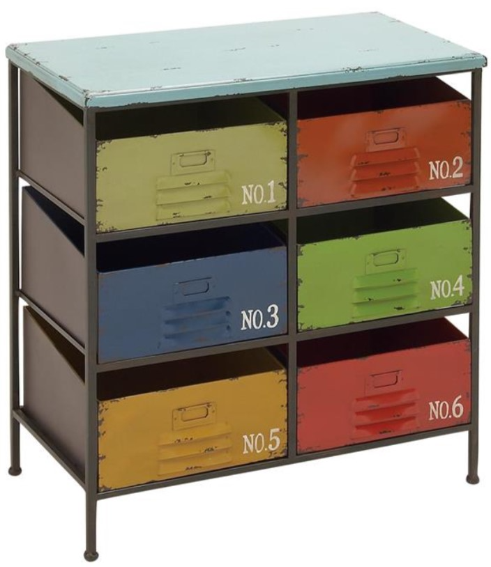 It gives charm and personality to your industrial space with its multi-colored finish. Features sturdy metal frame with six rectangular colored drawers with louvered design.