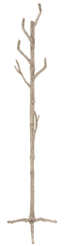 Silver metal coat rack features a tall silhouette in a tree branch inspired structure with 8 functional hooks and tripod style leg stand.