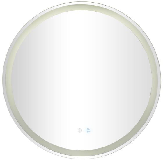 The large frameless LED wall mirror features a flat and rounded rectangular frame with a frosted inner border, innovative power switch, and anti-steam buttons at the mirror's bottom center body