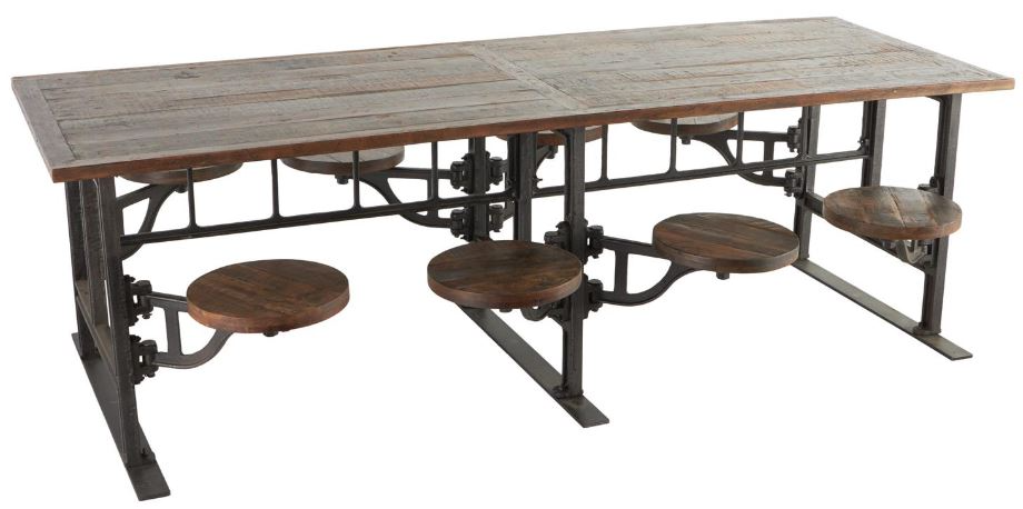 A matte black finish can be seen on the metal frame and mechanicals, while a polished dark brown wood with marbling is evident on the rectangular tabletop and round chairs. This industrial dining table features 8 built-in seats that helps save space in small interiors.