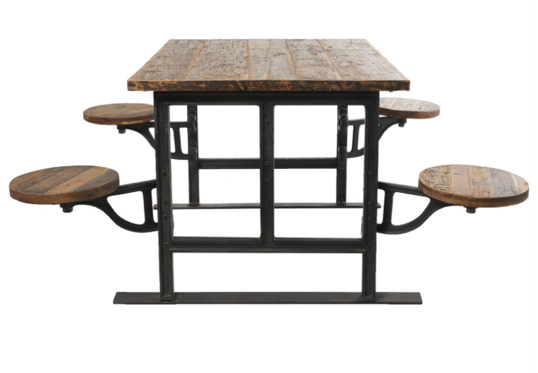 A matte black finish can be seen on the metal frame and mechanicals, while an oiled dark brown wood with marbling is evident on the rectangular tabletop and round chairs. This industrial dining table features 4 built-in seats that helps save space in small interiors