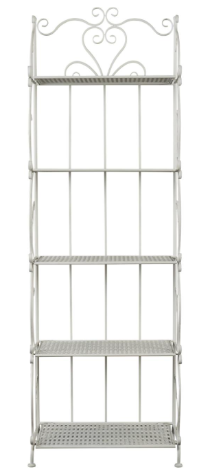 This is a single white colored display shelf. Iron bakers rack features 5 shelves
