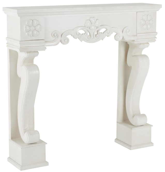 Rectangle fireplace mantle features a matte white finish that makes it a perfect addition to any space. This wood mantle for fireplaces includes intricate floral accents that enhance its traditional look.