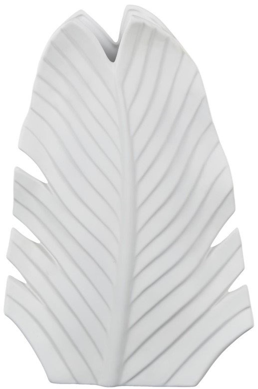 The matte white vase for dried flowers has a wide leaf shape with linear patterns that add sophistication to any space