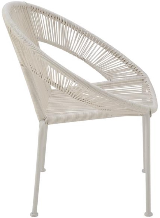 This solid white garden chair carries a rounded seat with backrest and 4 metal legs