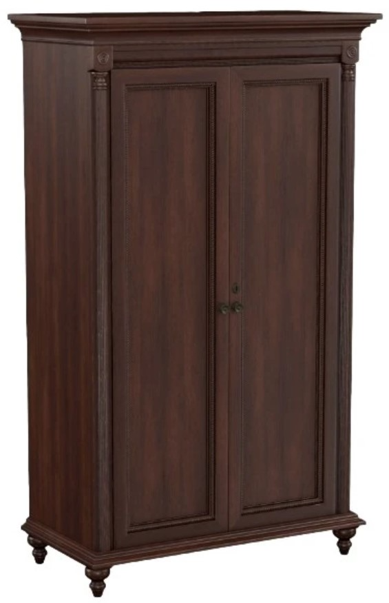 Crafted of worm-maple wood with rich molding and gently turned feet, this armoire features dual doors opening to adjustable shelves, a removable clothing bar, and four soft-close drawers. Fully customizable in finish and hardware, it delivers elegant form and tailored storage for a refined bedroom setting.Read More