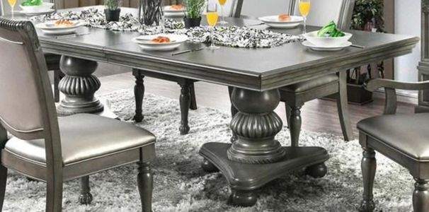 Shine up your silverware, bring out the glassware and get ready for the dinner party of the century with this glorious, traditional style dining table. The ornate double pedestal base provides the perfect structure for the crisscross patterned table top that, with its large 24-inch expandable leaf, can fit all the friends and family you can imagine. Pair with upholstered chairs featuring gray leatherette, rope-like trim and elegant carved legs.