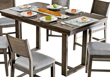 Perfect for casual family dinners or game nights, this contemporary style counter height set provides the ultimate cozy atmosphere. The soothing gray finish is complimented with light gray fabric upholstery for a classic look. A center beam provides extra support and added charm to blend style and functionality into one beautiful piece.