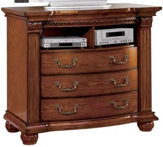 A luxurious masterpiece set in antique tobacco oak finish, this elegantly carved and designed media chest brings a level of sophistication. French dovetail drawers with antique gold hardware add functionality and style to this beautiful bedroom piece.Read More