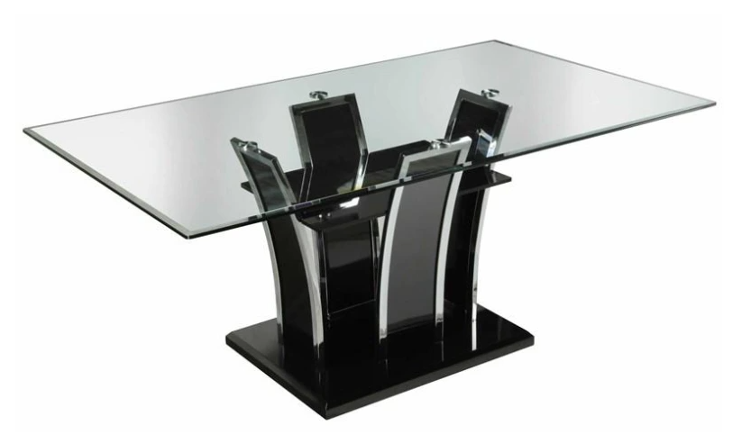 Curves define the foundation of this sophisticated dining set. The sweeping sides of the lacquer-coated table and the arched chrome chair legs combine to bring a modern feel to any space.