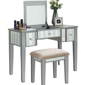 Vanities work best with large spaces. Big drawers for storage, a nice table top, multiple large mirrors for a full range of angles. Luckily this vanity features all of those. The mirrored paneling helps bring more light to your room and creates a shining beacon for you to follow and work at in the mornings. Sit at the matching padded stool and enjoy your prep time.Read More