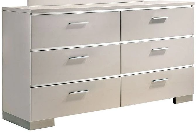 This bedroom dresser brings a modern feel with a splash of alluring chrome accents that help it pop out. A streamlined design uses added chrome strips at the drawer meets to emphasize the geometric shapes and horizontal lines of the box formed designs.Read More