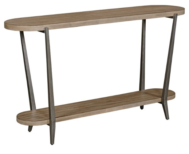 This collection is part of a larger trend towards curving and retro influenced design styling. This sofa table has a surfboard shape and comes equipped with one shelf. The finish on the wood for this piece is a beautiful Wheat color with a burnished gun metal finish on the metal base.Read More