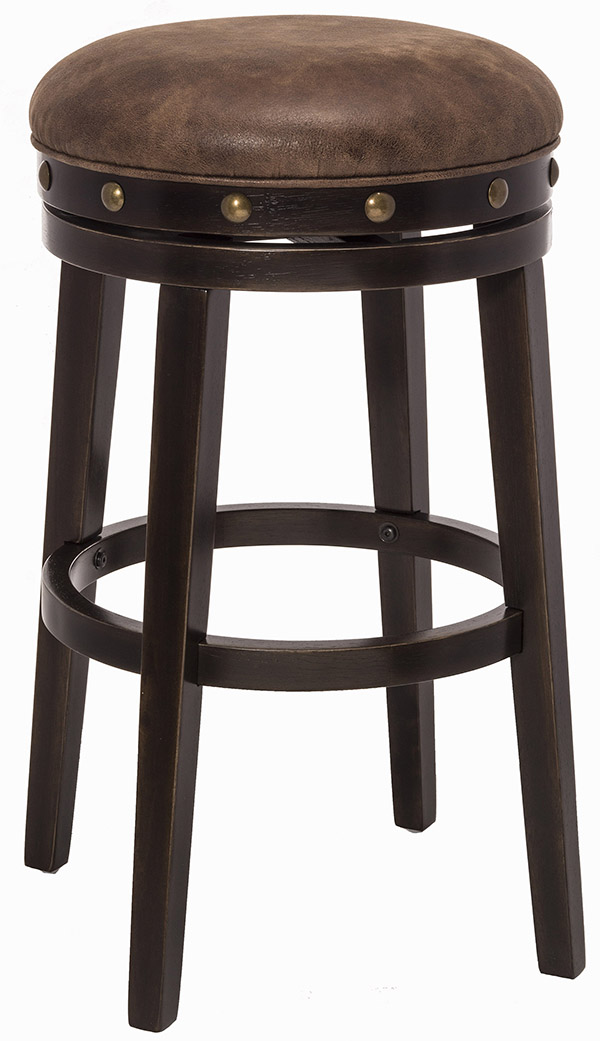 Simple and studded. The Hillsdale Furniture Benard Backless Swivel Counter Height Stool has a downplayed design that features oversized nail head accents and welt piping around the seat to add visual interest. Its unique Smoke Brown wood finish and Deep Brown faux leather upholstery make it an ideal addition to most color palettes and décor. And comfort is top-of-mind: a perfectly placed footrest and padded seat with 360° swivel functionality offer a relaxing experience to you and your guests. Perfect for use at kitchen islands or counter-height dining tables. Some assembly required.
