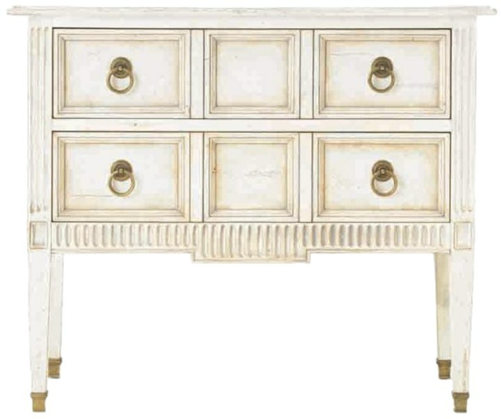 Introducing the Abbey Nightstand. This elegant piece features four spacious drawers with brass ring pull hardware and brass ferrules providing both style and functionality. Crafted from rustic cherry veneers and maple solids with medium distressing, it adds a touch of sophistication to any bedroom or living space.Read More