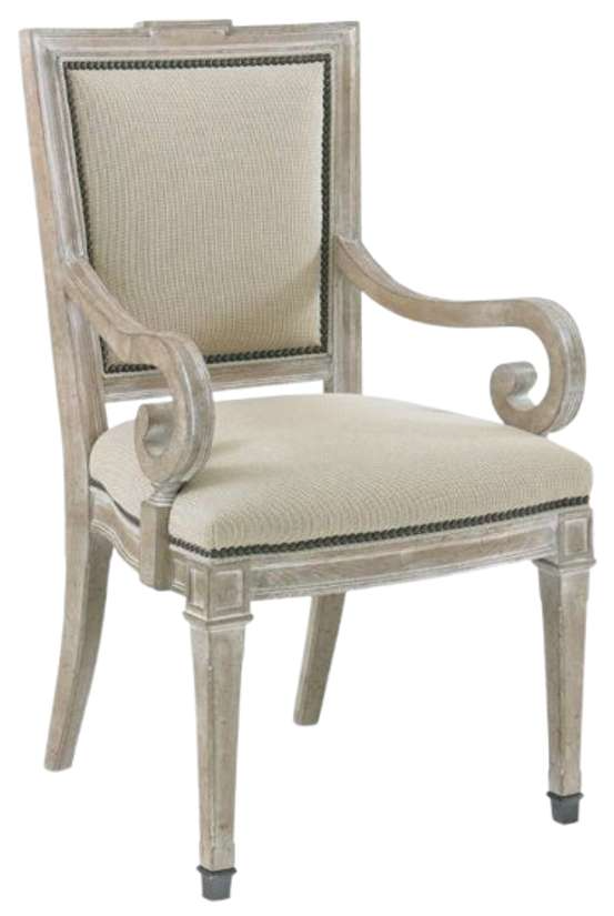 Elevate your dining room with this Andrew Arm Chair from Hickory White. Shown in a nickel and washed canvas wood finish, this dining chair features European beech solids with medium distressing. Make a bold statement by incorporating this furniture into your home.Read More