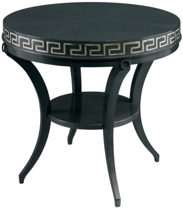 The Hickory White Customizable Ruby Ebony Side Table. Its rich ebony finish is accentuated by black nickel hardware and optional hand-painted platinum Greek key detailing on the apron, offering a blend of modern elegance and timeless craftsmanship.Read More