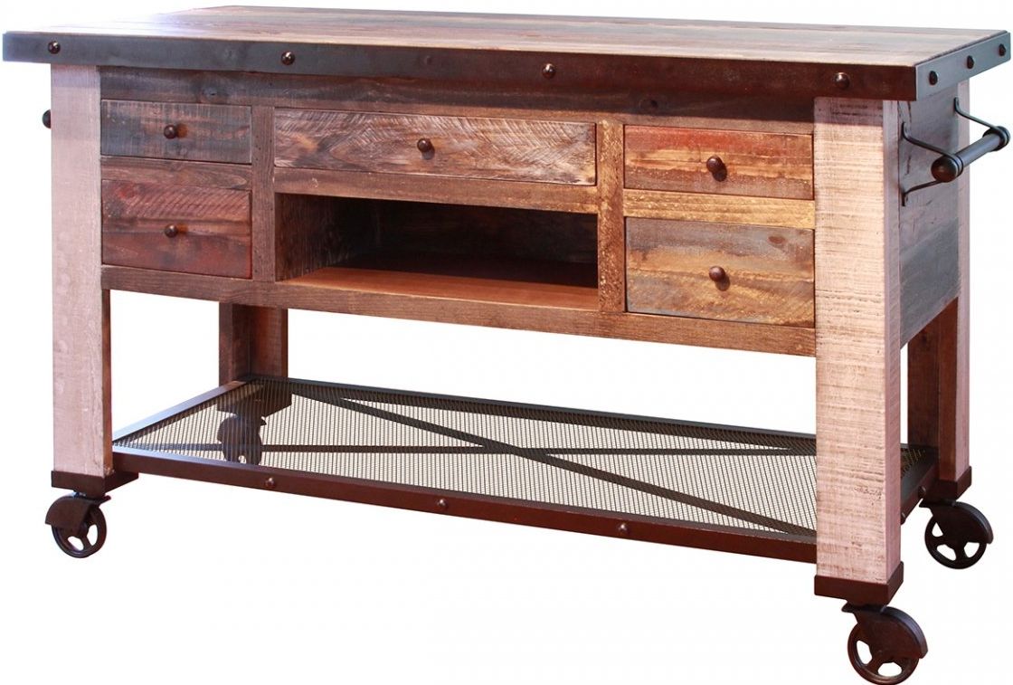 Featuring selected pine on top and hand wrought iron throughout. Multi color distressed finish on hand brushed wood. All tops are smooth and soft to the touch. Features storage drawers open compartments and a fixed shelf below.Read More