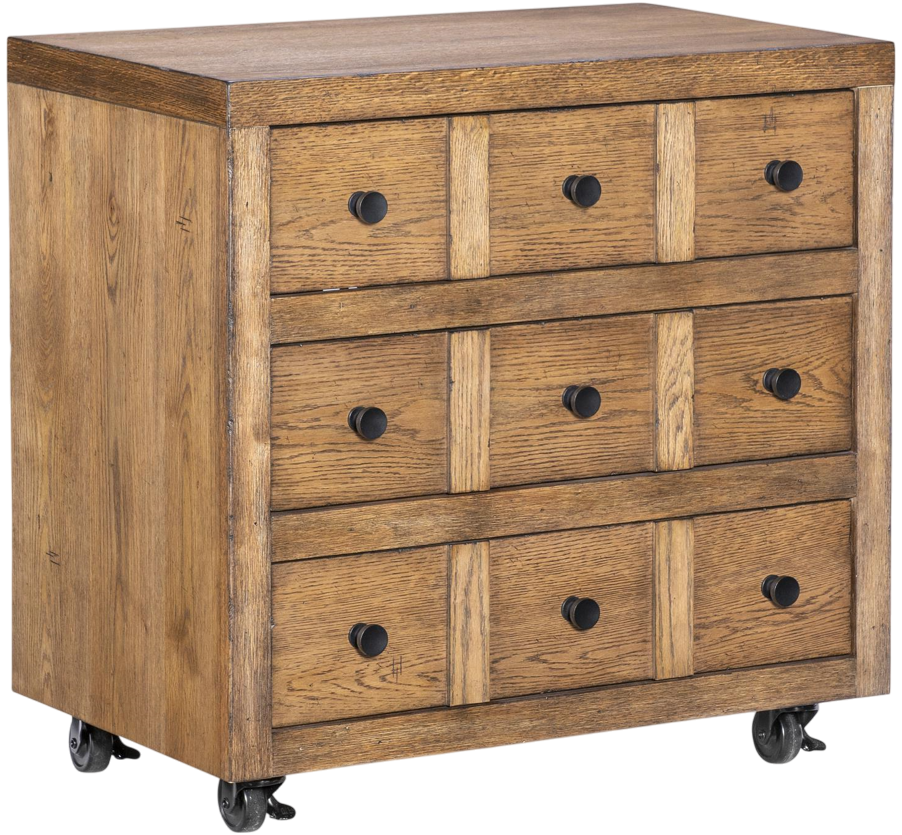 The Legacy Classic Vintage Market 3-drawer nightstand with casters is a charming and practical bedside piece that aesthetics with mobility and storage efficiency. Crafted from oak veneers and hardwoods, it showcases the signature barnwood oak finish—a warm, weathered tone that adds character while remaining versatile in decor.Read More