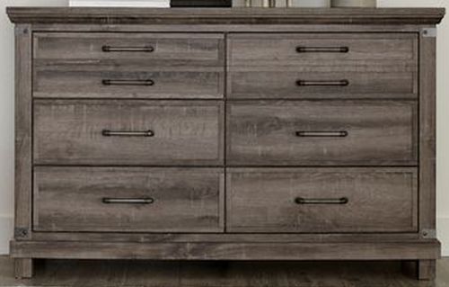 Hit the pause button on your hectic life with the Lakeside Haven six drawer dresser. Crafted with excellence using a rubberwood solid frame with 3D Paper Laminate, this piece features a Brownstone finish. Hammered metal corner accent plates along with wood framed drawer fronts and Antique Pewter bar pull hardware add for visual appeal.Read More