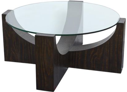 This round cocktail table pairs a clear glass insert with a wood-base structure, mounted on casters and levelers for ease of movement. Finished in rustic tavern, it balances rustic charm with functional convenienceRead More