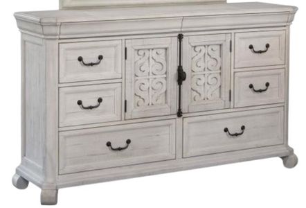 Dream big with the stylish Bronwyn bedroom collection. Its signature style is perfect for adding that wow factor to a bedroom. Crafted in an alabaster finish accented by Antique Brass hardware with pewter overlay, Bronwyn delivers true design versatility and can be paired with neutrals or bold color choices.Read More