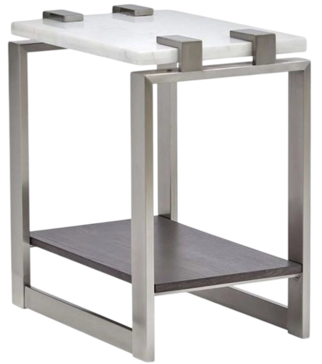 Magnussen® Home accent table featuring a pearl white marble top, roasted almond finished shelf and brushed platinum frame.Read More
