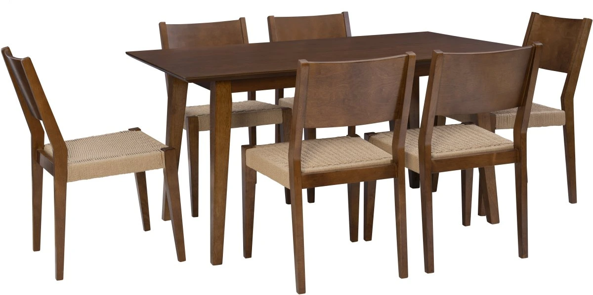 This elegant midcentury modern style dining set is the perfect centerpiece for family gatherings and meals. The sleek silhouettes embody the grace and simplicity of the classic design movement, while handwoven rope seats help to evoke a more rustic and welcoming atmosphere.Read More