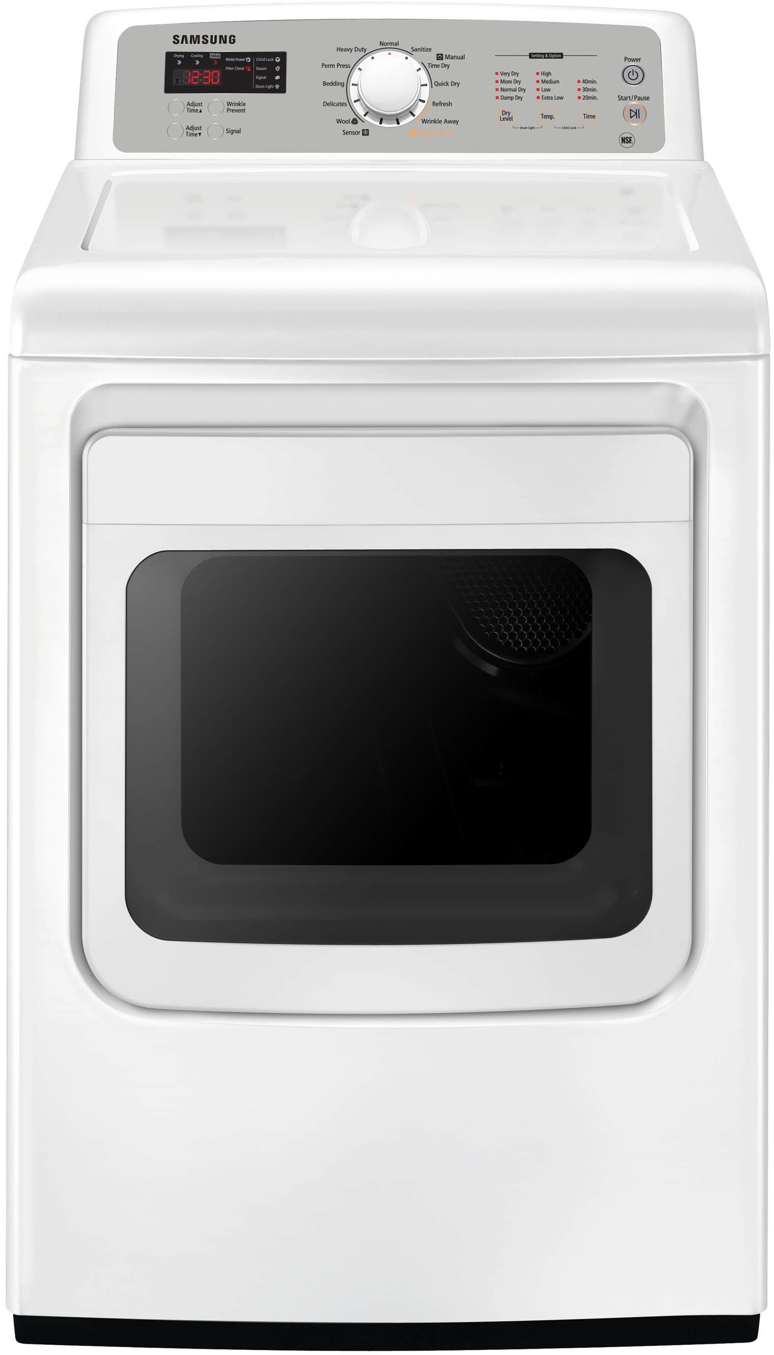 Samsung 7.4 Cu. Ft. Neat White Electric Dryer features stainless steel drum for longer life, 13 preset drying cycles, end-of-cycle adjustable signal, and steam clean for safer wash, longer clothing life.Read More