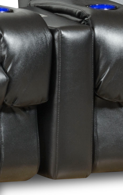 Sleek and elegant, the Roxie Home Theater recliner fits well among today's lifestyle room settings. Padded-track design element begins midway up one arm then continues around to frame the bustle back cushions, then returns down the opposite arm. The Roxie would stand regally alone or more dramatically in rows. Be sure to note the seven color capable LED system in BOTH cup holders as well as floor illumination. Decorative French seams in the pad-over chaise seat cushions continue onto the kidney back pillow.