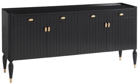 Moderne meets midcentury modern in this singular sideboard buffet. Channeled paneled design conceived with four drawers and doors, detailed with oval Hampton brass finished handles. Sideboard top is ready to serve with a three-quarter gallery. Lobed reeded tapered legs with brass cappings.Read More