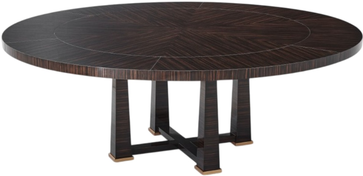 An Austrian center table with neoclassical DNA caught inspired this extendable dining table. Striking sunburst Amara veneered top with Amara finish expands with six radial leaves. The pedestal is a series of four square reversed tapered legs joined by an X stretcher. Hampton brass finish feet.Read More