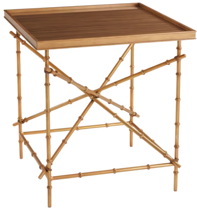 Side table or sculpture? Ingrid is that rare design, a work of art, and a beautiful accent table. The base is a network of the faux bamboo cast in brass with brass strappings. The table top is veneered with a glass overlay. An eglomise tray top completes the design. Organic and sophisticated.Read More