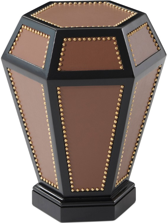 The modestly scaled Penelope accent table has strong architectural lines. This faceted end table is an ideal decorative gesture in most any design plan. Hexagon top and paneled base are inlaid with Caramel finish leather, trimmed in nailheads and set on a plinth base.Read More
