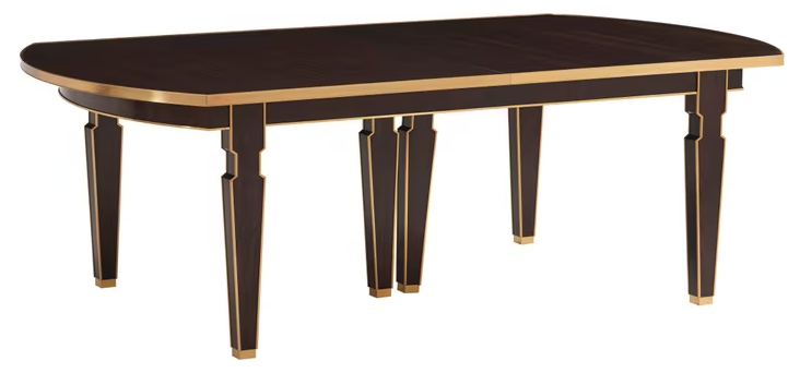 Sebastiano combines a historic silhouette with an edgy modern sensibility. Rectangular dining table is curved with an apron bound in brass. Set on slatted baluster legs outlined in gilt. Company coming? It’s an extendable dining room table with three leaves.Read More
