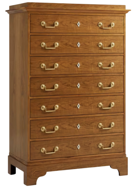 Cherry veneer, brassa biedermeier moment, architectural detailing shines in the seven-drawer viggo chest of drawers fitted with brass handles (in our Hampton brass finish) and ivory-finish escutcheons. Beautiful stepped-caddy dresser top and bracket feet. Solid cherry and veneers.Read More